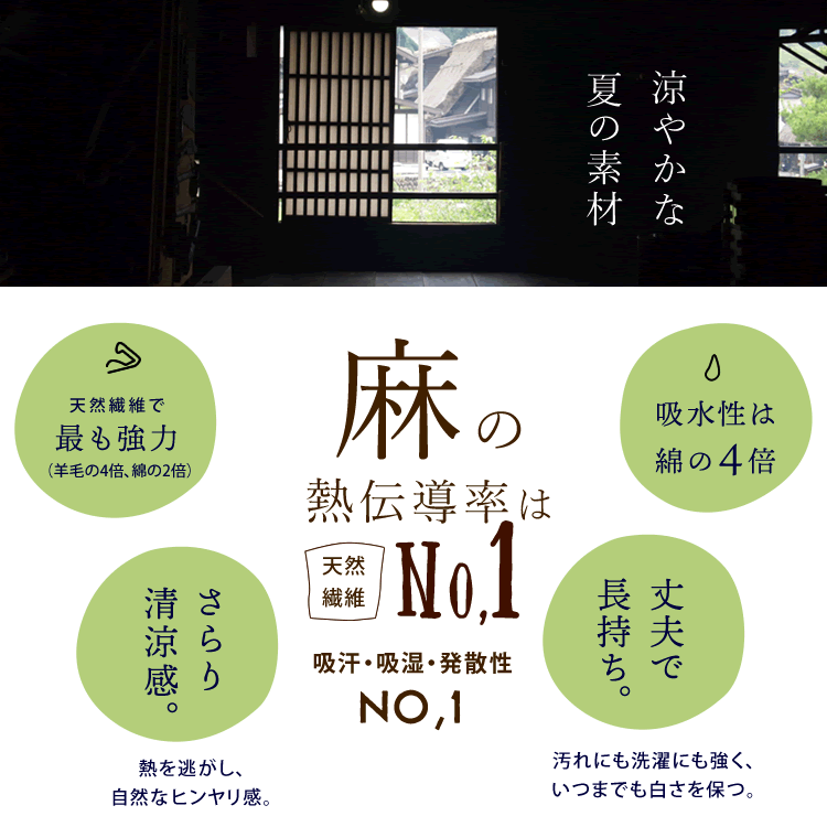 麻は昔から、高温多湿の蒸し暑い夏をしのぐ、涼感豊かな素材だとされています。