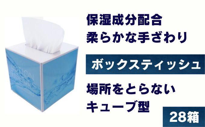 【ふるさと納税】保湿成分配合ティッシュペーパー28箱 キューブ型ボックスローションティッシュ 【 雑貨 日用品 ボックスティッシュ 箱ティッシュ ティッシュ ローションティッシュ 紙 】 【柔らか触感のボックスティッシュ】・保湿成分を配合し、優しい肌触りが◎【場所をとらないキューブ型】・箱の形状が正方形であるため通常のティッシュに比べ、省スペースに有効。